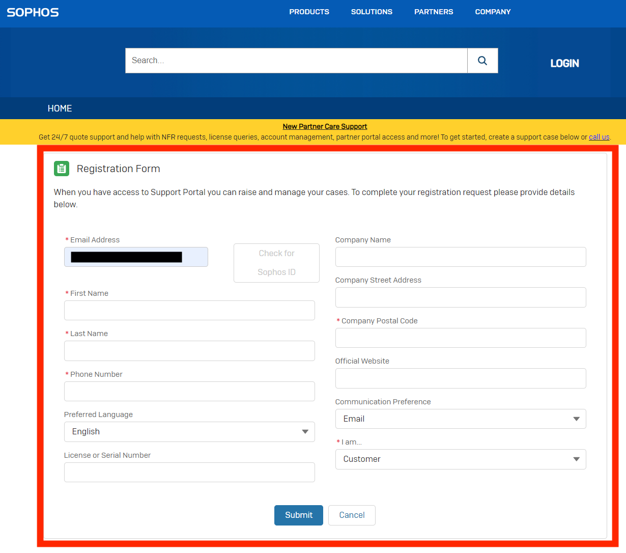 Geben Sie alle benötigten Informationen in das Formular ein. Nach dem Ausfüllen des Formulars erhalten Sie eine Bestätigungs-E-Mail von Sophos. Dies kann 2-3 Tage dauern.